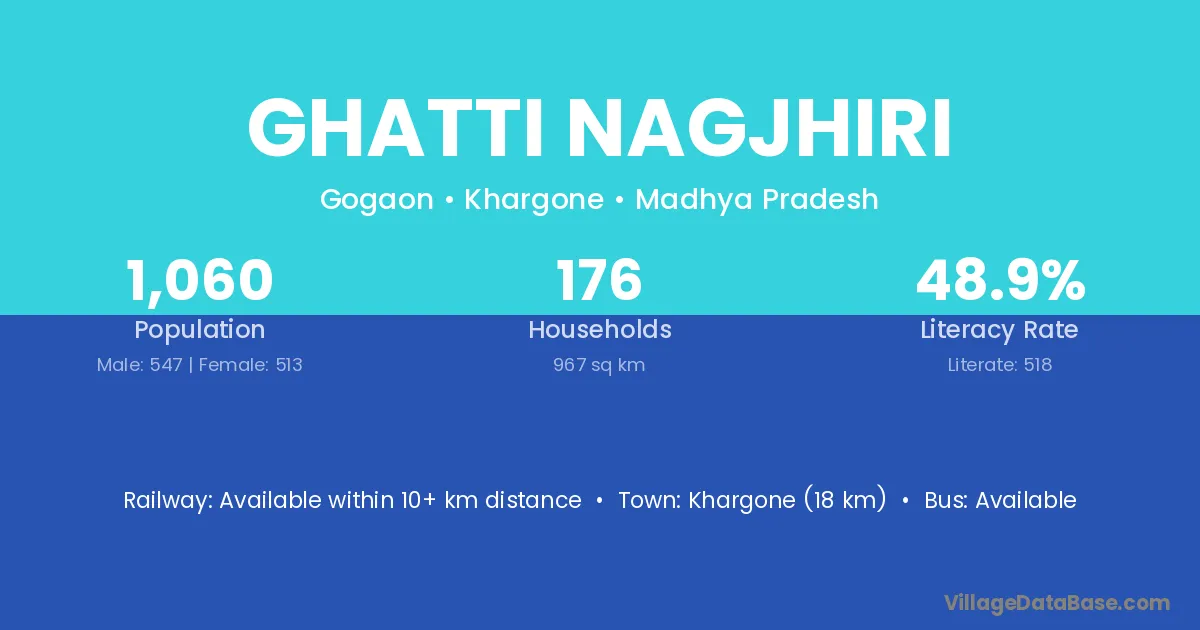 Khargone (18 km) is the nearest town to Ghatti Nagjhiri village for major economic activities and is located approximately 18 km away.