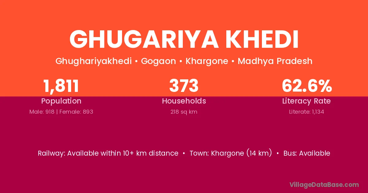 Ghugariya Khedi village has a total population of 1,811 people, of which 918 are males and 893 are females.
