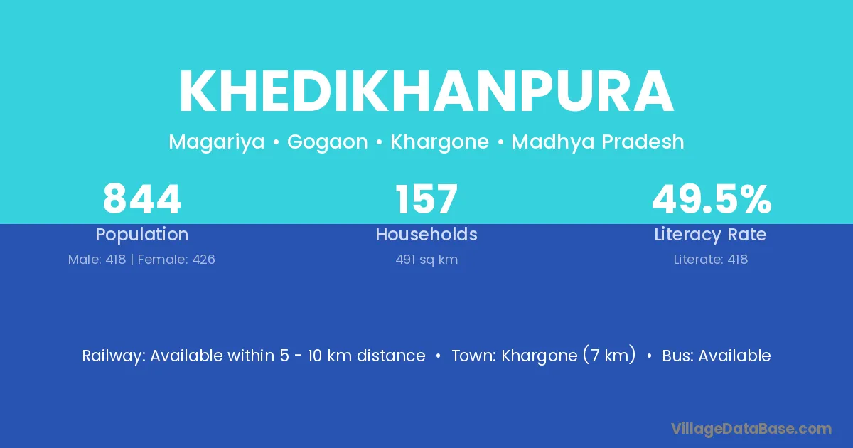 Khargone (7 km) is the nearest town to Khedikhanpura village for major economic activities and is located approximately 7 km away.