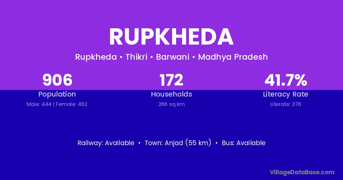 Khargone (19 km) is the nearest town to Rupkheda village for major economic activities and is located approximately 19 km away.