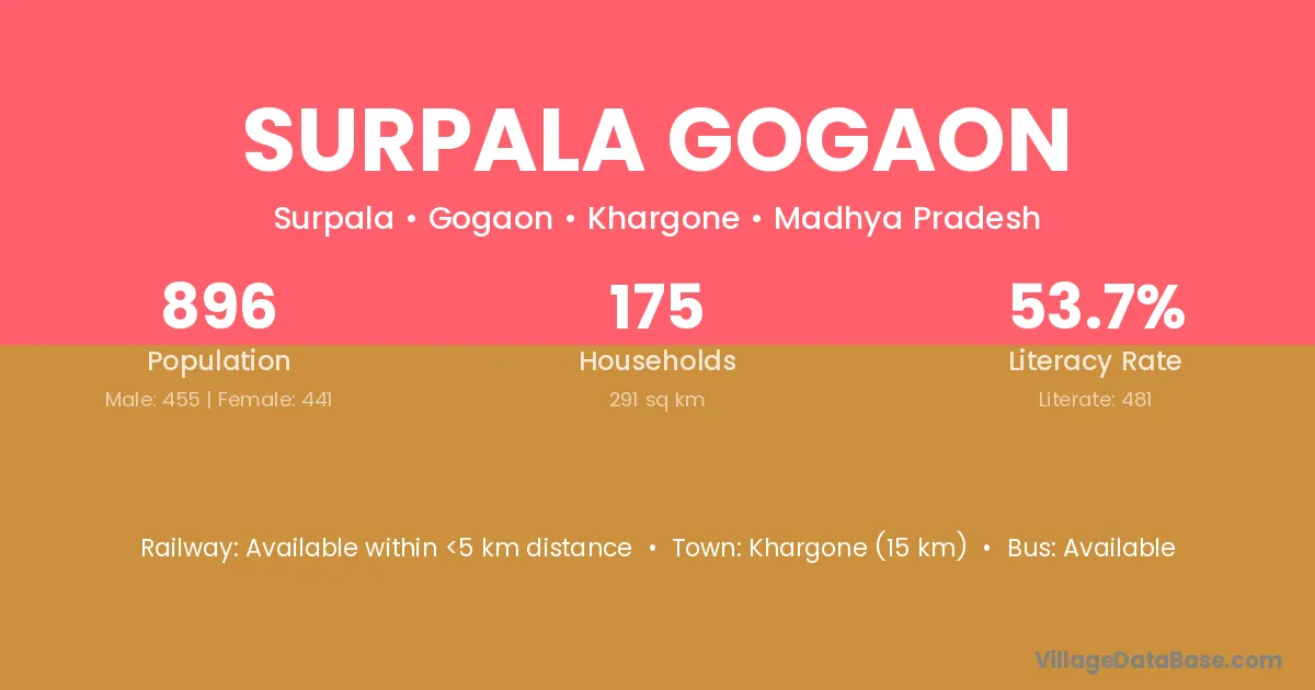 Khargone (15 km) is the nearest town to Surpala Gogaon village for major economic activities and is located approximately 15 km away.