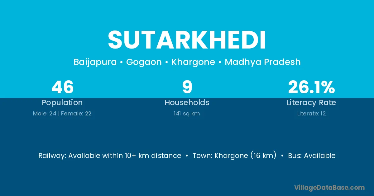 Khargone (16 km) is the nearest town to Sutarkhedi village for major economic activities and is located approximately 16 km away.