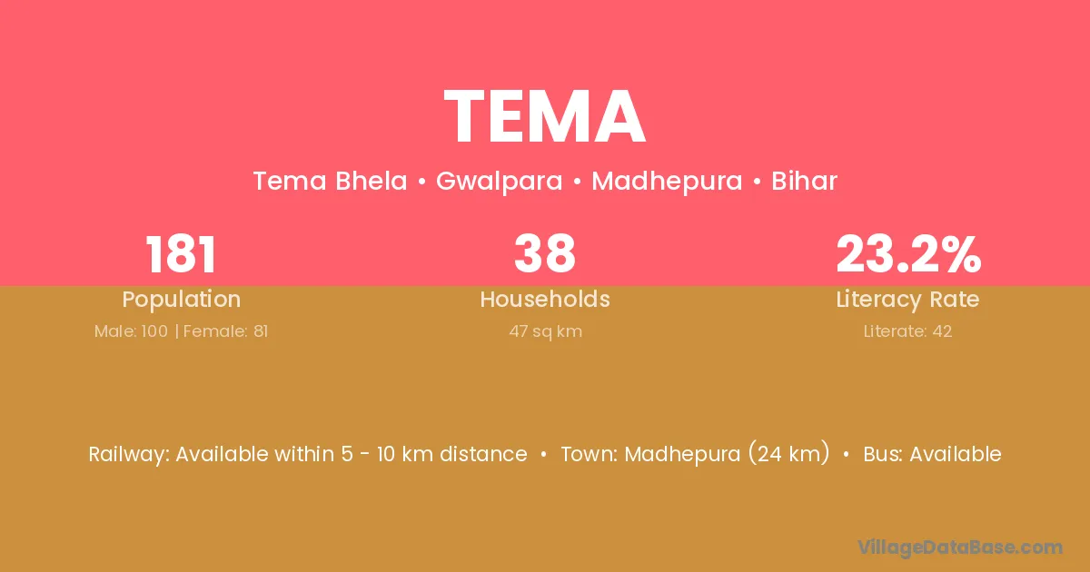 Khargone (26 km) is the nearest town to Tema village for major economic activities and is located approximately 26 km away.