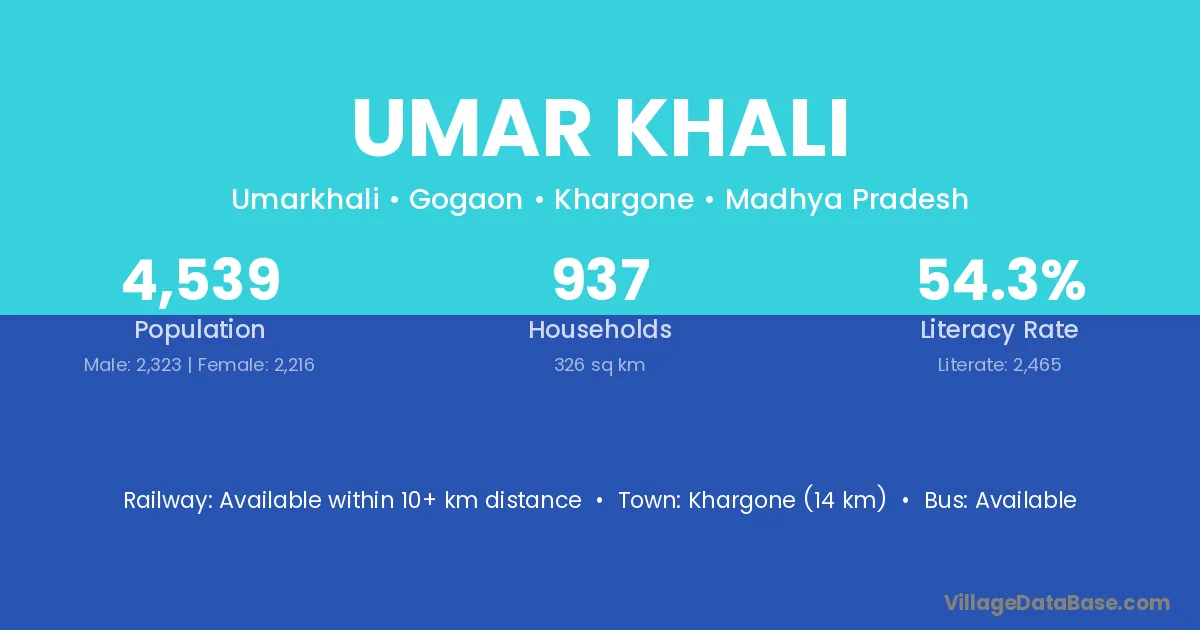 Umar Khali village has a total population of 4,539 people, of which 2,323 are males and 2,216 are females.