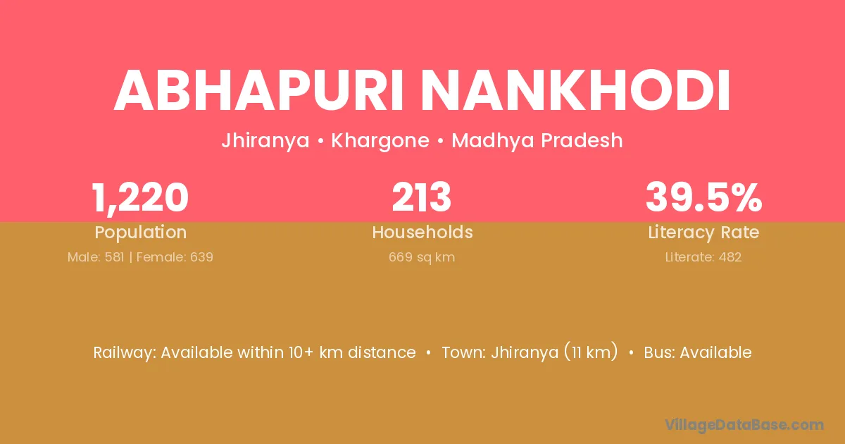 Abhapuri Nankhodi village has a total population of 1,220 people, of which 581 are males and 639 are females.
