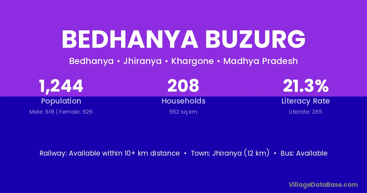 Bedhanya Buzurg village has a total population of 1,244 people, of which 618 are males and 626 are females.