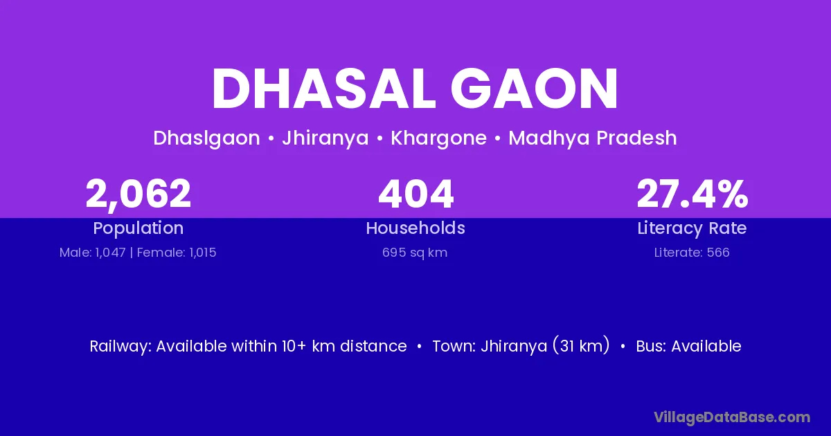 Jhiranya (31 km) is the nearest town to Dhasal Gaon village for major economic activities and is located approximately 31 km away.
