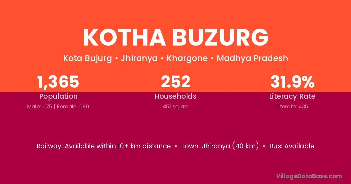 Jhiranya (40 km) is the nearest town to Kotha Buzurg village for major economic activities and is located approximately 40 km away.