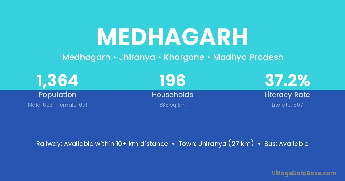 Jhiranya (27 km) is the nearest town to Medhagarh village for major economic activities and is located approximately 27 km away.