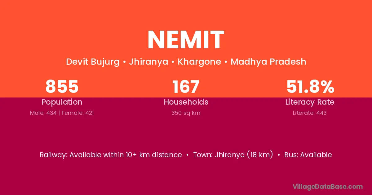Jhiranya (18 km) is the nearest town to Nemit village for major economic activities and is located approximately 18 km away.