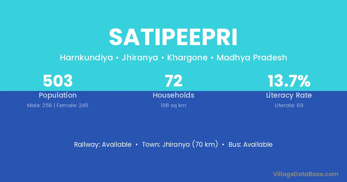 Jhiranya (70 km) is the nearest town to Satipeepri village for major economic activities and is located approximately 70 km away.