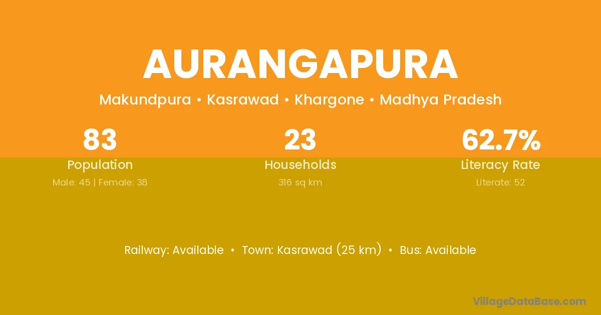 Kasrawad (25 km) is the nearest town to Aurangapura village for major economic activities and is located approximately 25 km away.