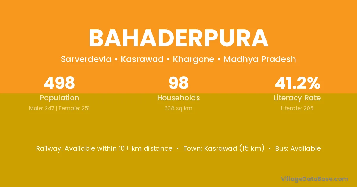 Kasrawad (15 km) is the nearest town to Bahaderpura village for major economic activities and is located approximately 15 km away.