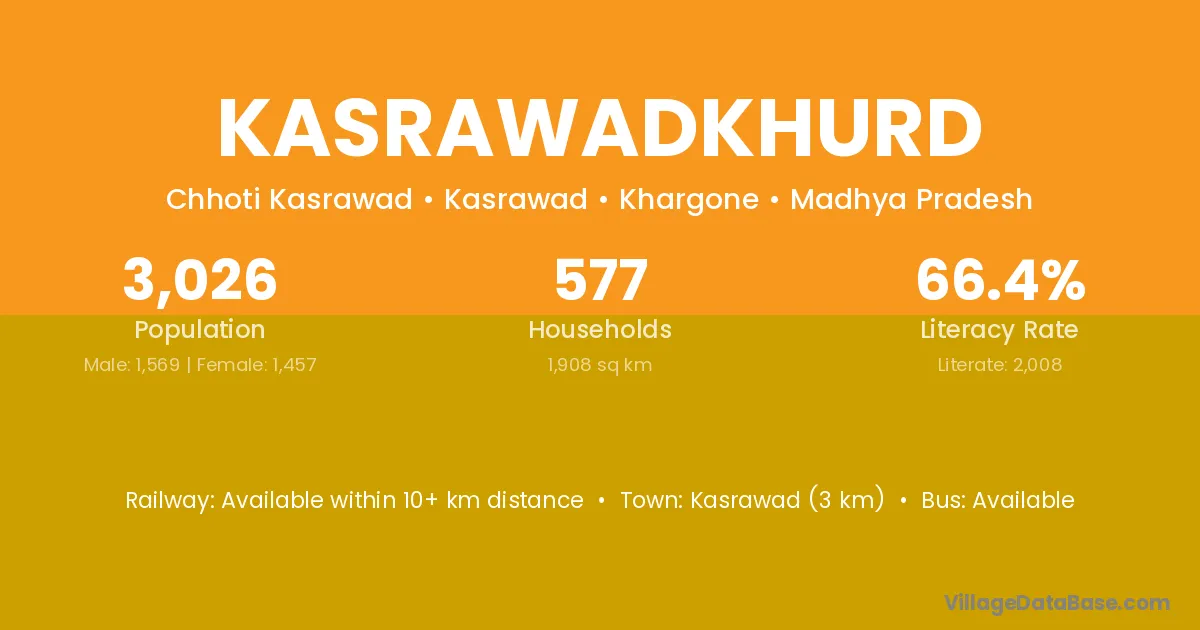 Kasrawad (3 km) is the nearest town to Kasrawadkhurd village for major economic activities and is located approximately 3 km away.