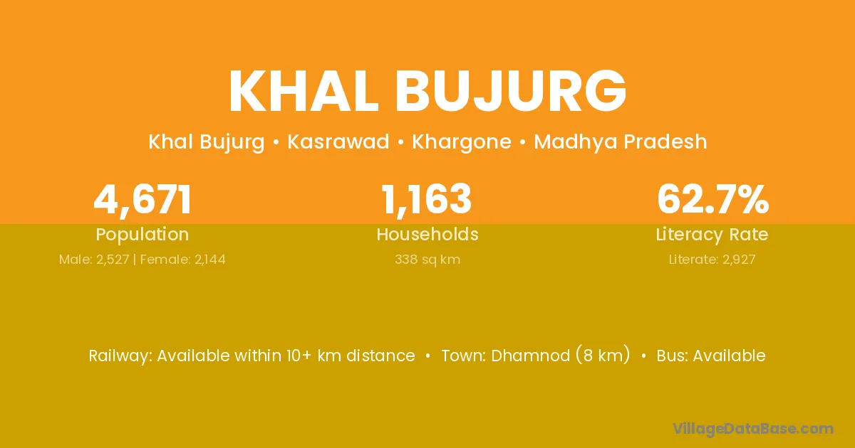 Dhamnod (8 km) is the nearest town to Khal Bujurg village for major economic activities and is located approximately 8 km away.