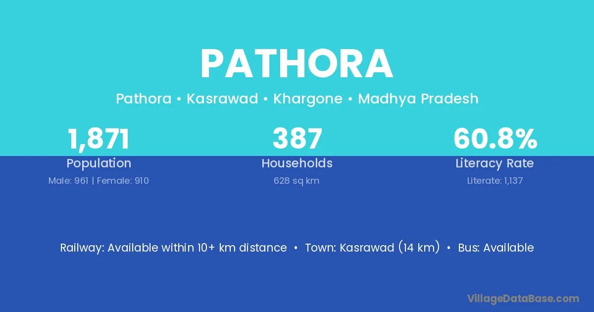 Kasrawad (14 km) is the nearest town to Pathora village for major economic activities and is located approximately 14 km away.