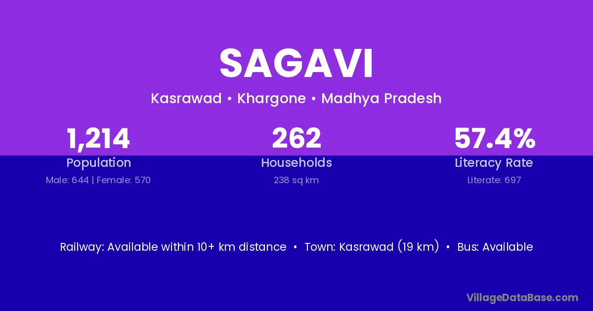 Kasrawad (19 km) is the nearest town to Sagavi village for major economic activities and is located approximately 19 km away.