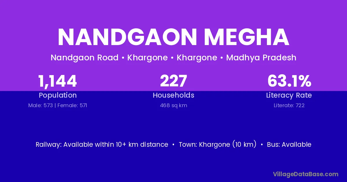 Khargone (10 km) is the nearest town to Nandgaon Megha village for major economic activities and is located approximately 10 km away.