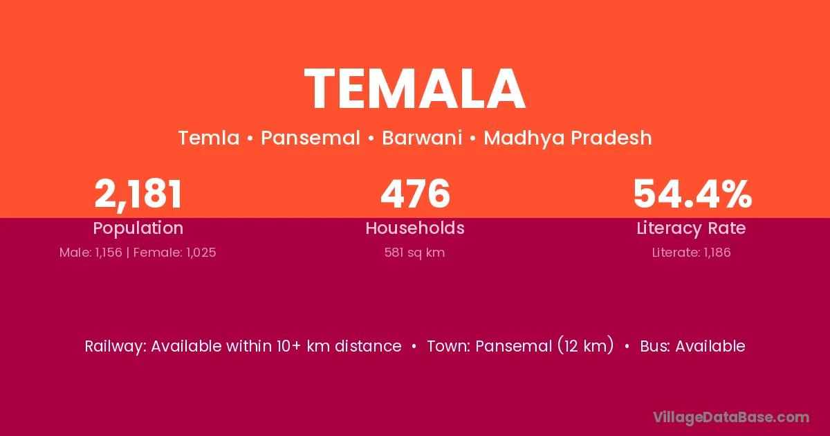 Khargone (10 km) is the nearest town to Temala village for major economic activities and is located approximately 10 km away.