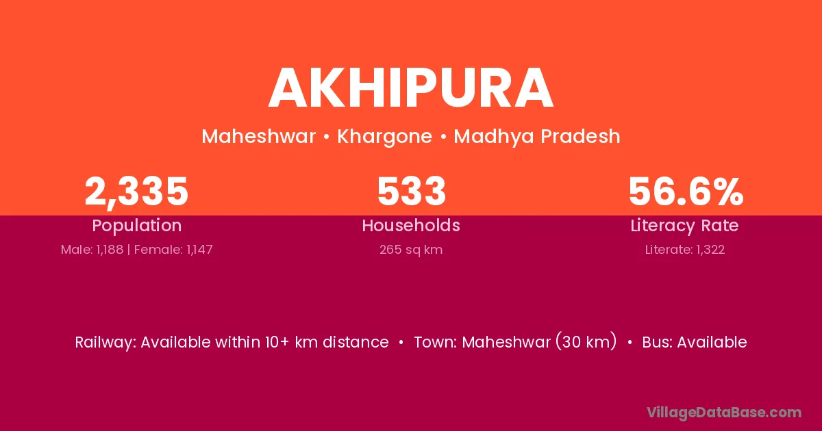 Maheshwar (30 km) is the nearest town to Akhipura village for major economic activities and is located approximately 30 km away.