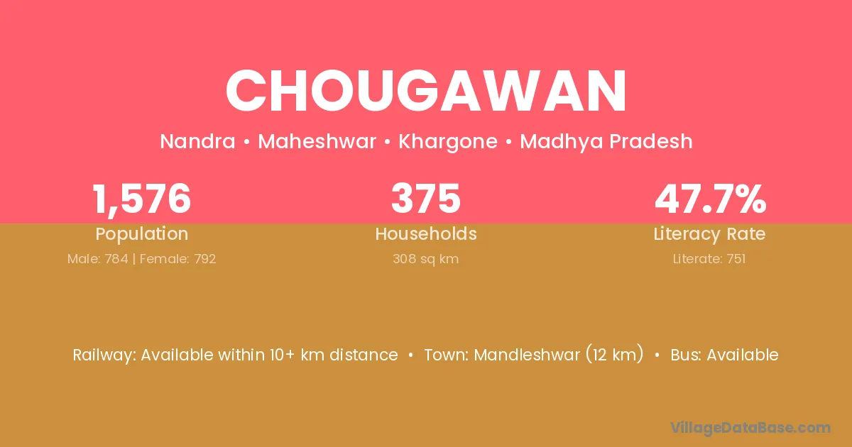 Mandleshwar (12 km) is the nearest town to Chougawan village for major economic activities and is located approximately 12 km away.