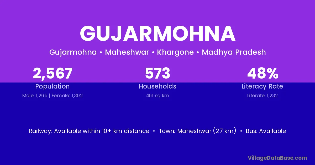 Maheshwar (27 km) is the nearest town to Gujarmohna village for major economic activities and is located approximately 27 km away.