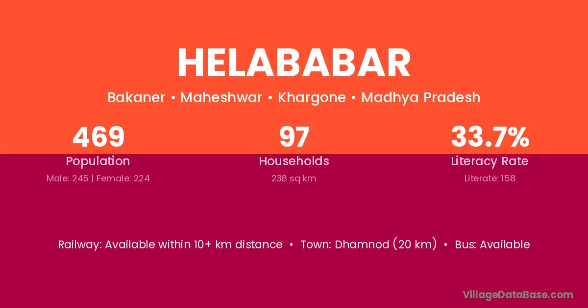 Dhamnod (20 km) is the nearest town to Helababar village for major economic activities and is located approximately 20 km away.
