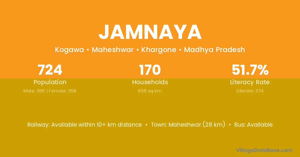 Maheshwar (28 km) is the nearest town to Jamnaya village for major economic activities and is located approximately 28 km away.