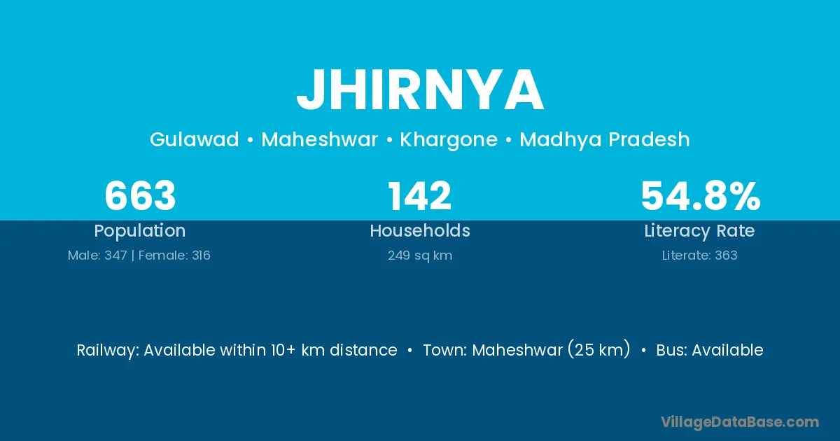 Maheshwar (25 km) is the nearest town to Jhirnya village for major economic activities and is located approximately 25 km away.