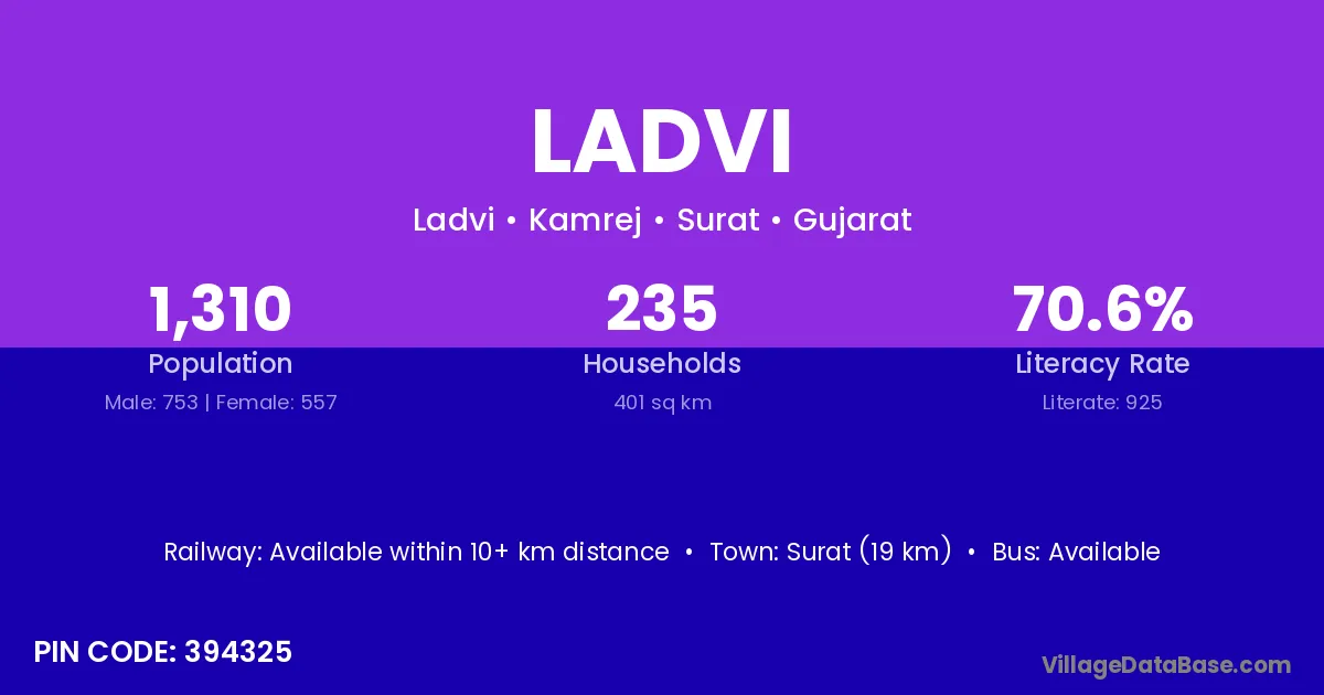 The literacy rate of Ladvi village is 60.83%. Male literacy stands at 69.46% and female literacy at 51.85%.