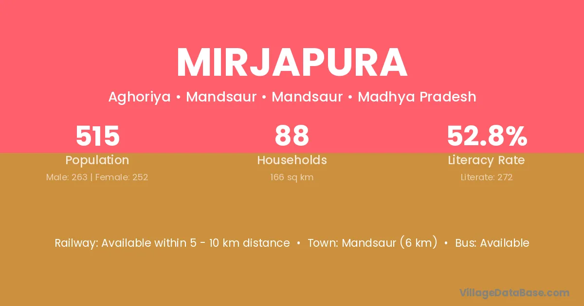Khargone (68 km) is the nearest town to Mirjapura village for major economic activities and is located approximately 68 km away.