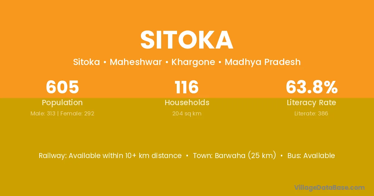Barwaha (25 km) is the nearest town to Sitoka village for major economic activities and is located approximately 25 km away.