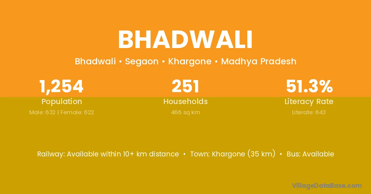 Khargone (35 km) is the nearest town to Bhadwali village for major economic activities and is located approximately 35 km away.