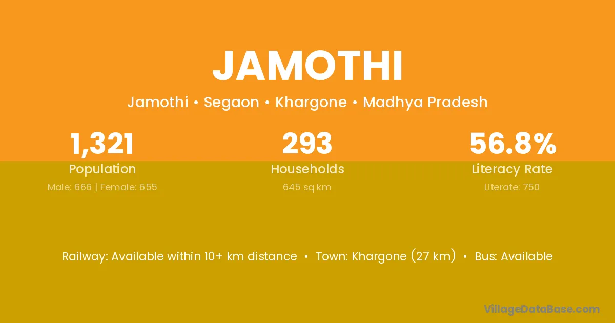 Khargone (27 km) is the nearest town to Jamothi village for major economic activities and is located approximately 27 km away.