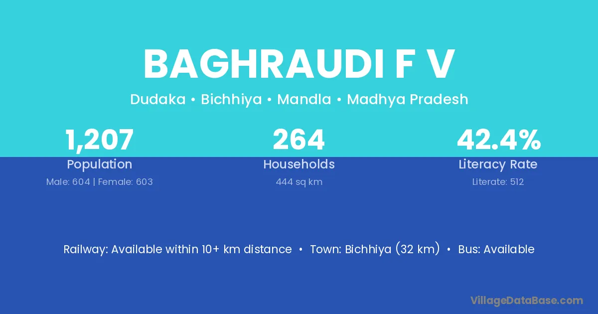 Bichhiya (32 km) is the nearest town to Baghraudi F V village for major economic activities and is located approximately 32 km away.