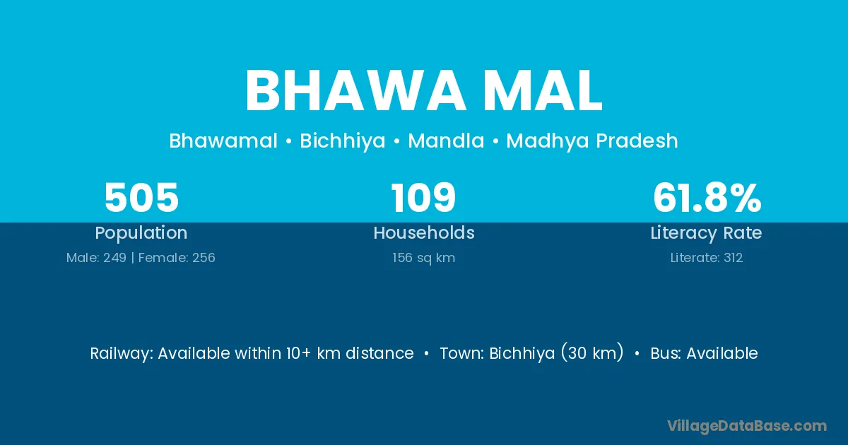Bichhiya (30 km) is the nearest town to Bhawa Mal village for major economic activities and is located approximately 30 km away.