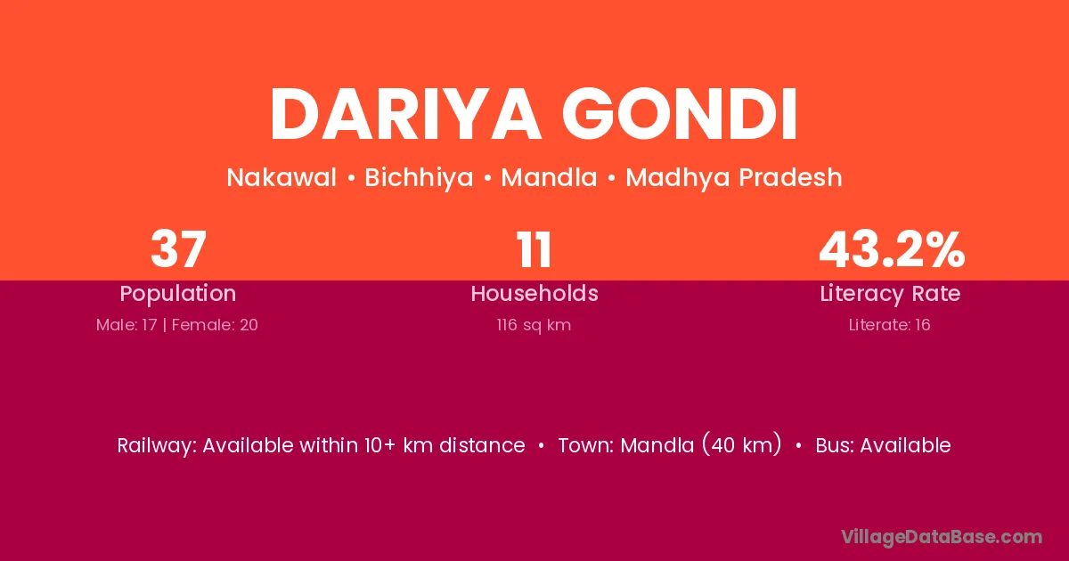 Mandla (40 km) is the nearest town to Dariya Gondi village for major economic activities and is located approximately 40 km away.