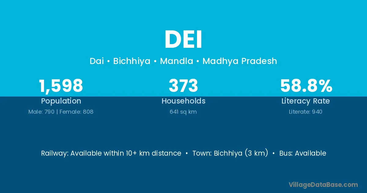 Bichhiya (3 km) is the nearest town to Dei village for major economic activities and is located approximately 3 km away.