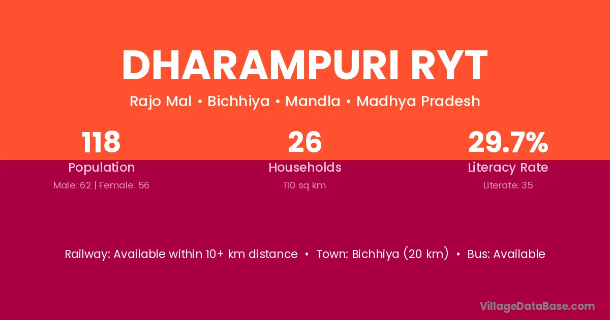 Dharampuri Ryt village has a total population of 118 people, of which 62 are males and 56 are females.