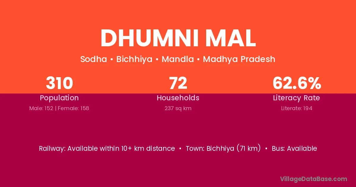 Bichhiya (71 km) is the nearest town to Dhumni Mal village for major economic activities and is located approximately 71 km away.