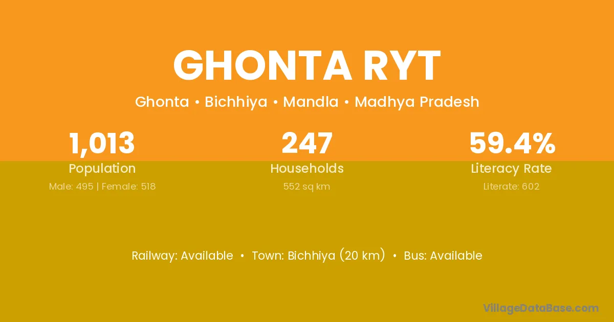 Bichhiya (20 km) is the nearest town to Ghonta Ryt village for major economic activities and is located approximately 20 km away.