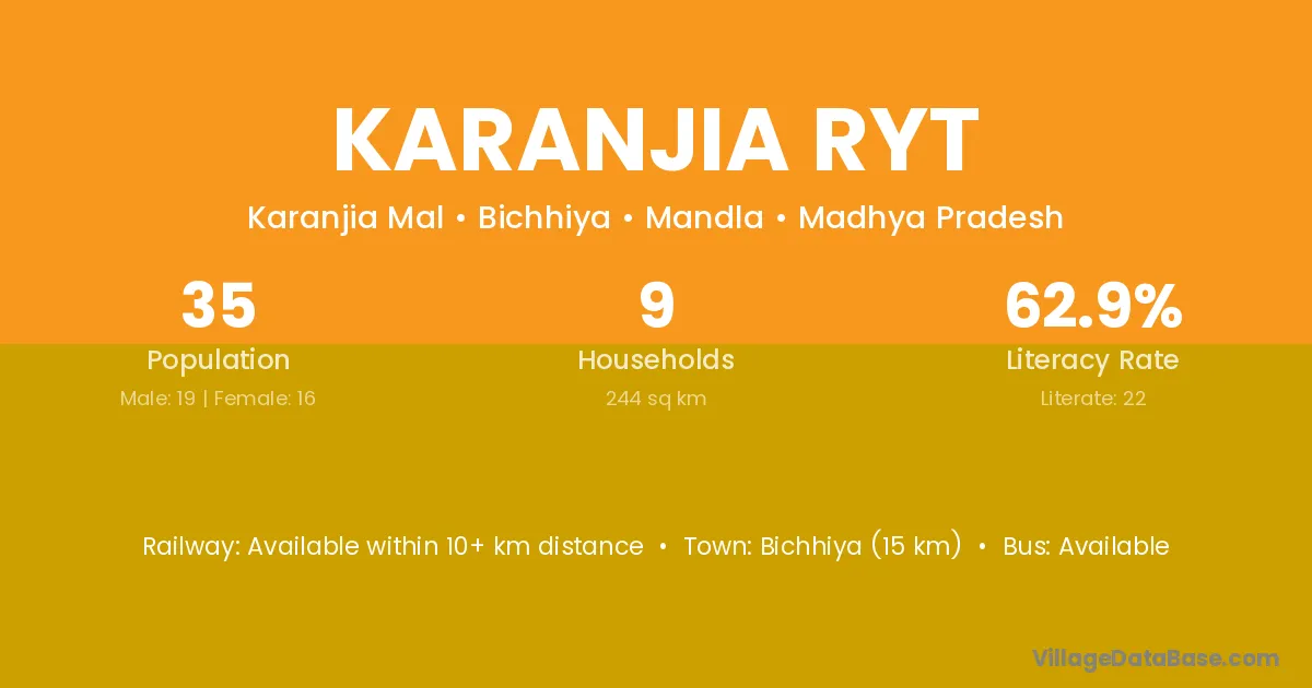 Bichhiya (15 km) is the nearest town to Karanjia Ryt village for major economic activities and is located approximately 15 km away.