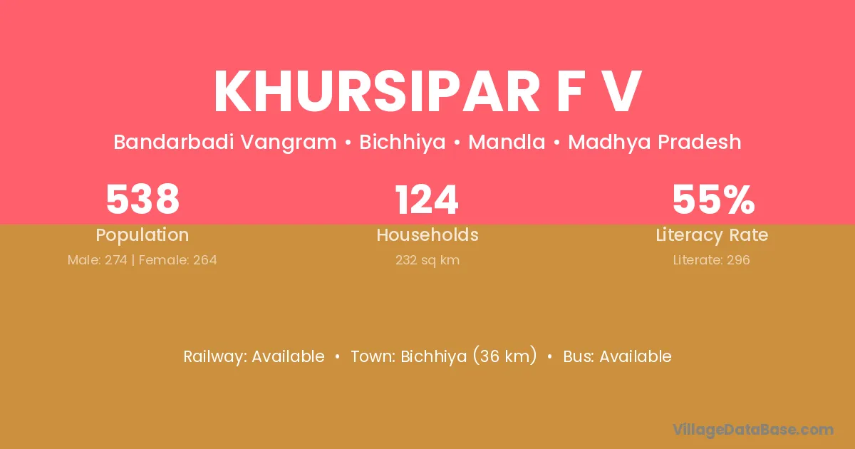 Bichhiya (36 km) is the nearest town to Khursipar F V village for major economic activities and is located approximately 36 km away.