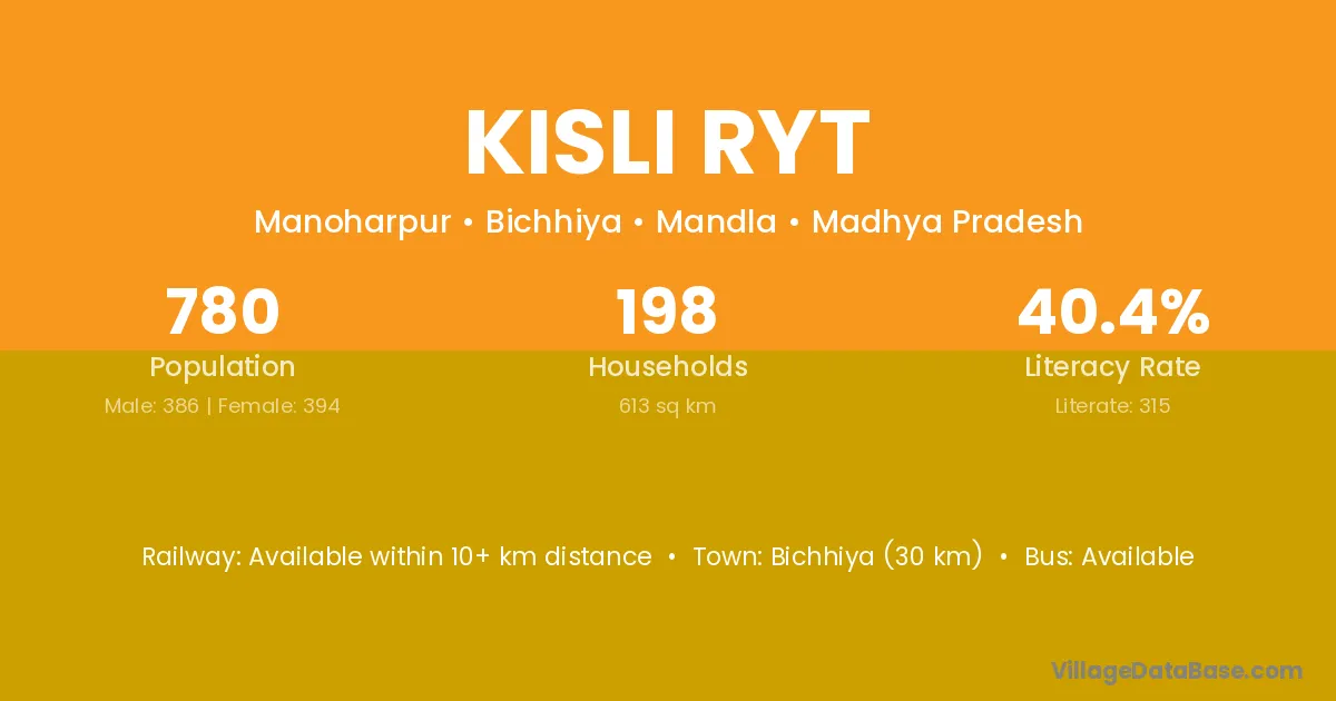Bichhiya (30 km) is the nearest town to Kisli Ryt village for major economic activities and is located approximately 30 km away.