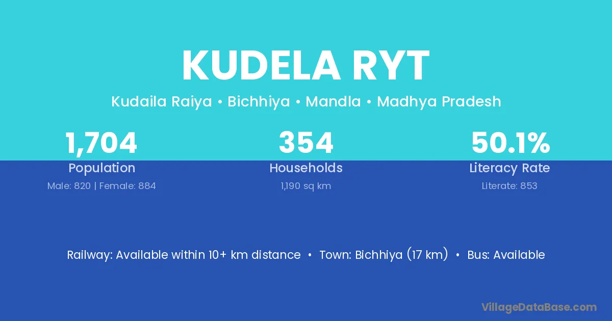Bichhiya (17 km) is the nearest town to Kudela Ryt village for major economic activities and is located approximately 17 km away.