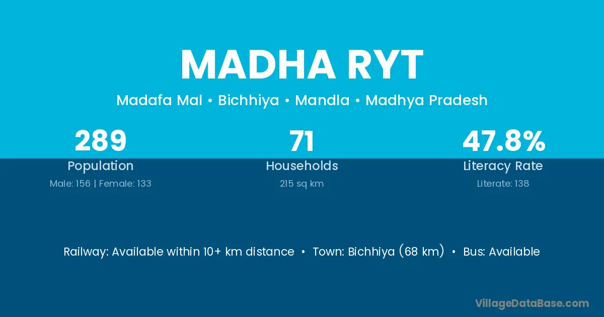 Bichhiya (68 km) is the nearest town to Madha Ryt village for major economic activities and is located approximately 68 km away.