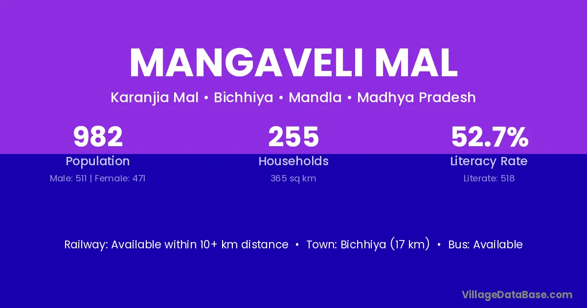 Bichhiya (17 km) is the nearest town to Mangaveli Mal village for major economic activities and is located approximately 17 km away.