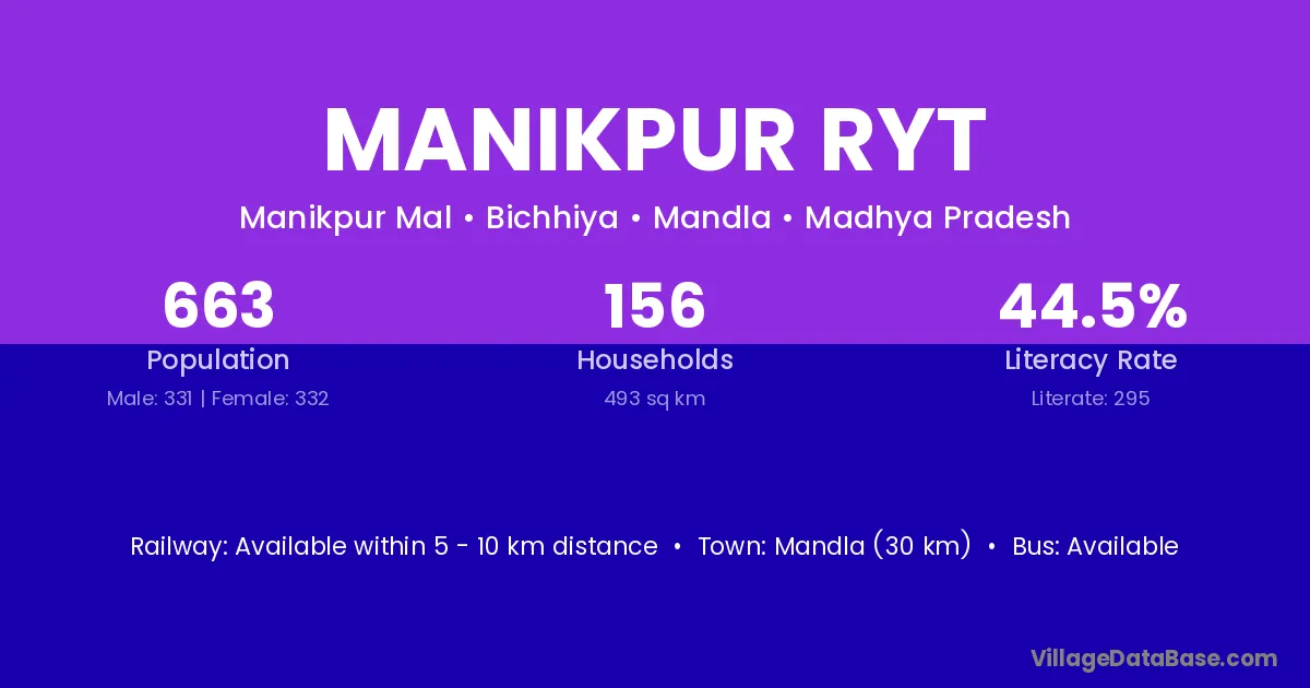 Mandla (30 km) is the nearest town to Manikpur Ryt village for major economic activities and is located approximately 30 km away.