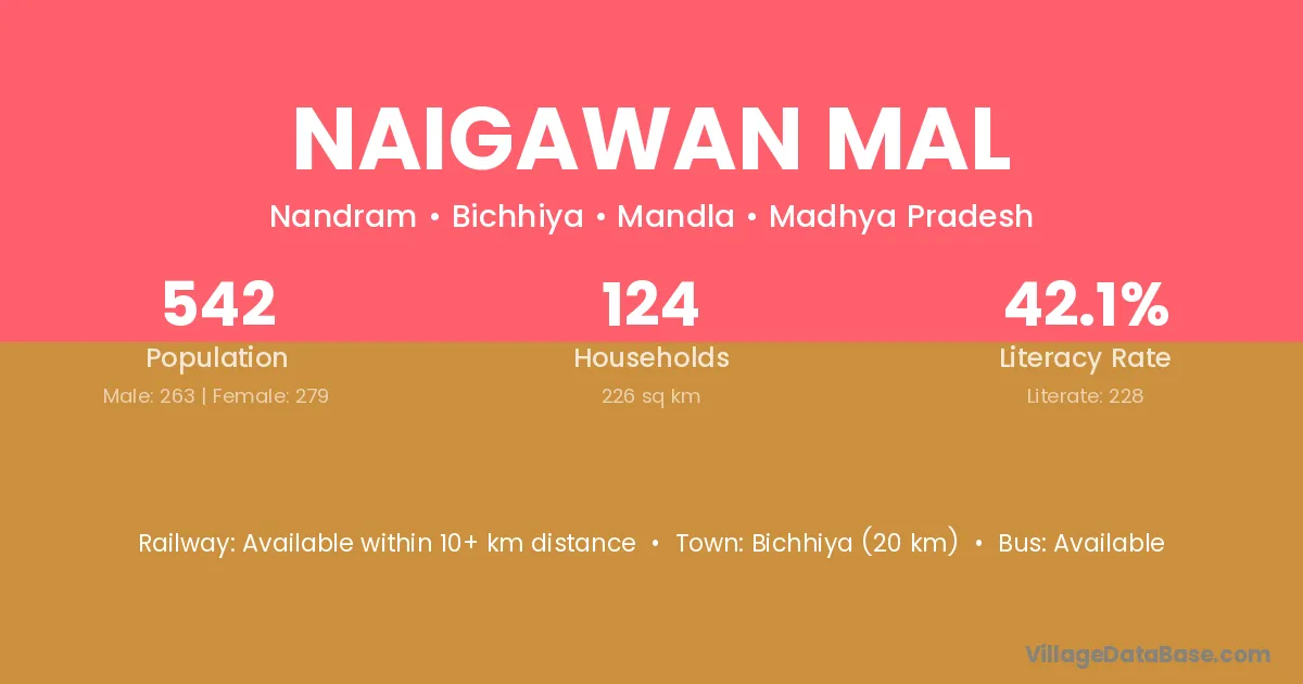 Bichhiya (20 km) is the nearest town to Naigawan Mal village for major economic activities and is located approximately 20 km away.
