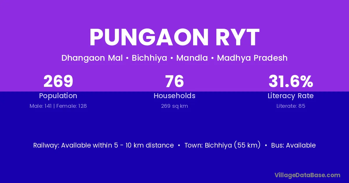 Bichhiya (55 km) is the nearest town to Pungaon Ryt village for major economic activities and is located approximately 55 km away.
